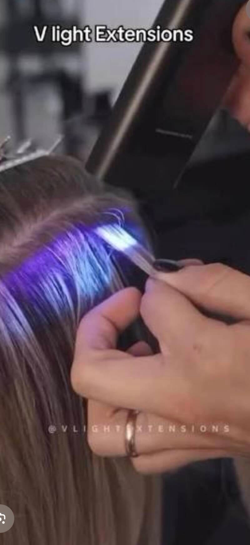 V-Light hair extensions are an advanced, non-damaging hair extension method designed especially for people with fine, thinning, or fragile hair. This technique uses a UV light and a keratin-based bonding gel to attach individual strands of hair directly to your natural hair—without heat, glue guns, tape, or braiding.